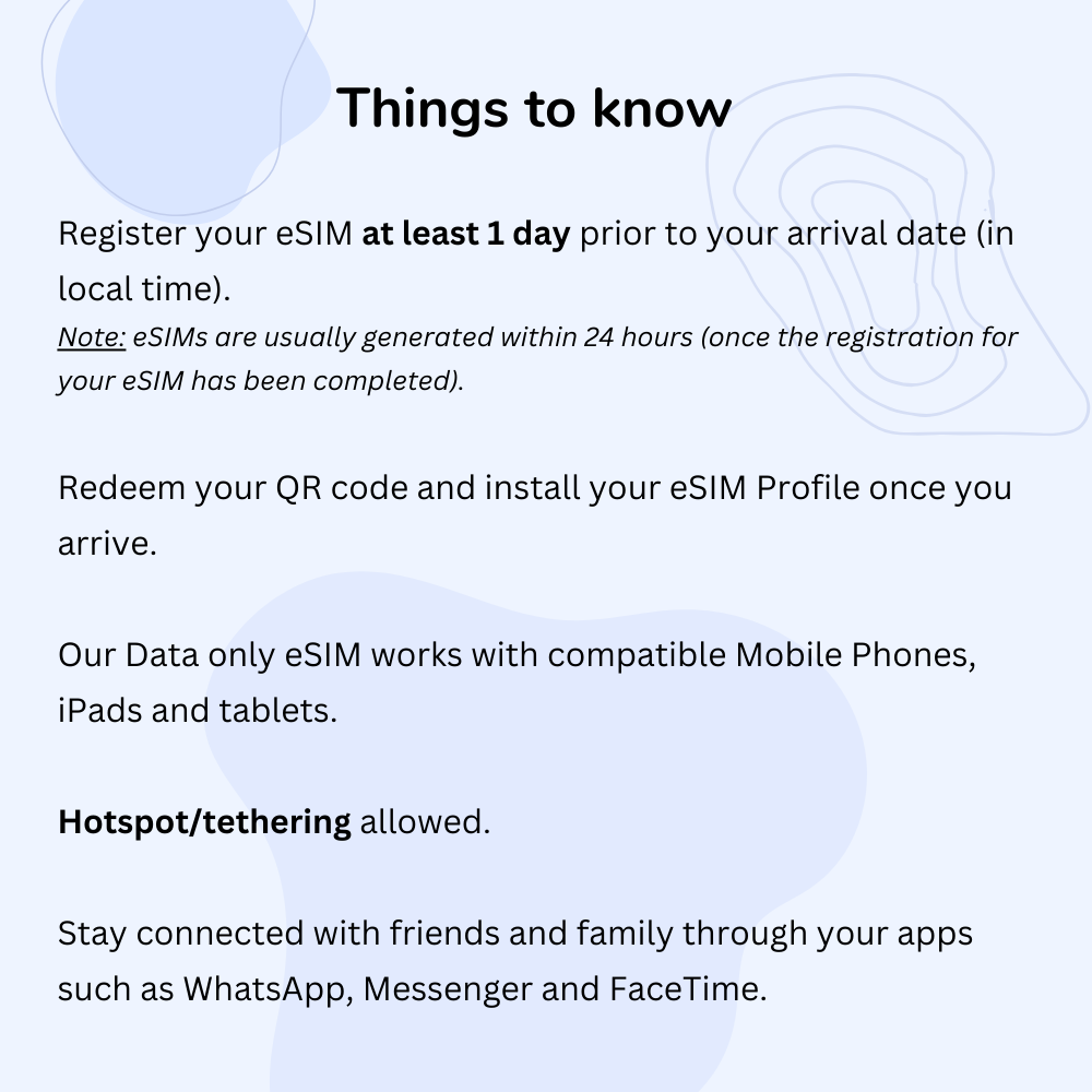 - Do not delete your eSIM profile — it cannot be reinstated or refunded.